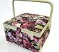 Virágokkal díszített szögletes varródoboz, belső, kivehető műanyag tálcával Kézimunka-kellékek, például fonalak, tűk és egyéb eszközök tárolására szolgál.